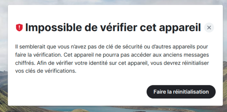 Dans le cas où vous n'avez pas généré la clé de sécurité et que vous n'êtes plus connecté à votre session, à la prochaine connexion, vous pourriez avoir le message ci-dessous. Il suffit de faire la réinitialisation et de suivre la procédure précédente.