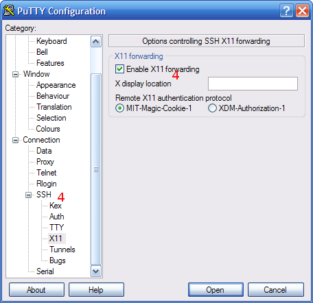 - Etape 4 : Si vous voulez activer le serveur X, cliquer sur l'item [-]SSH dans la fenêtre à gauche de PuTTY et sélectionner X11. Comme indiqué sur la figure.